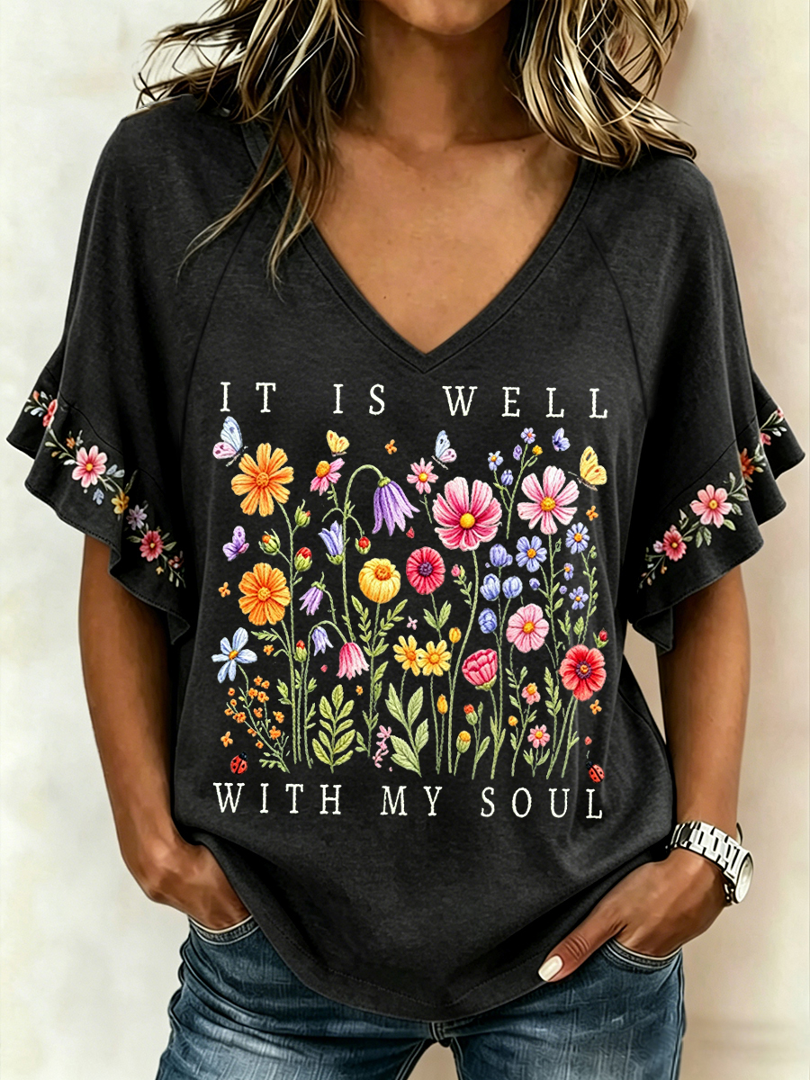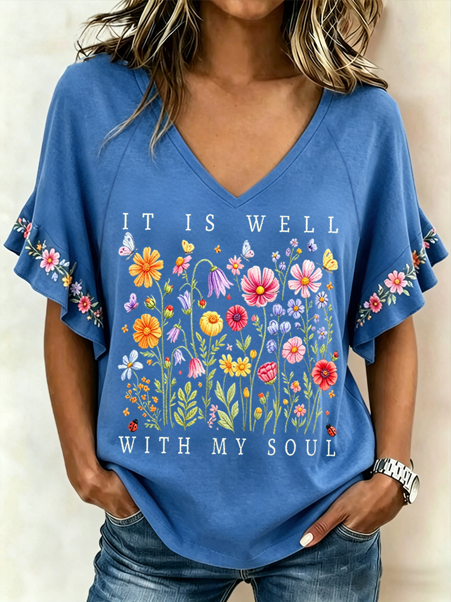 Women's It Is Well With My Soul Floral Print Casual Ruffle Sleeve Tee