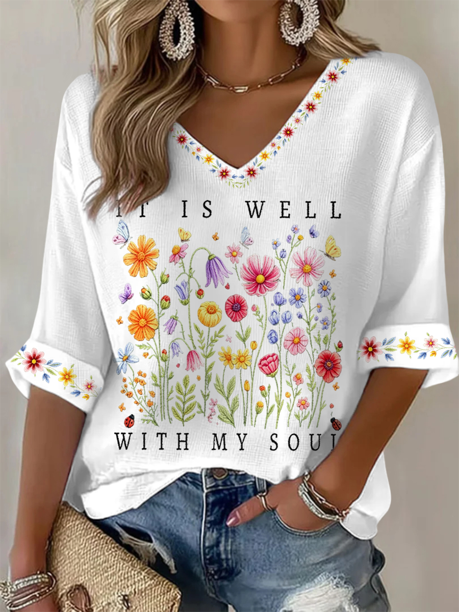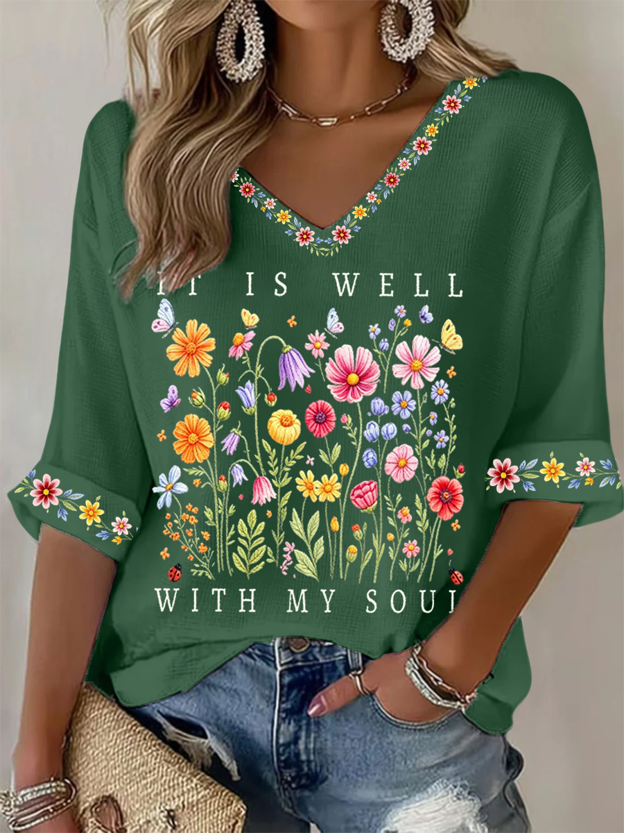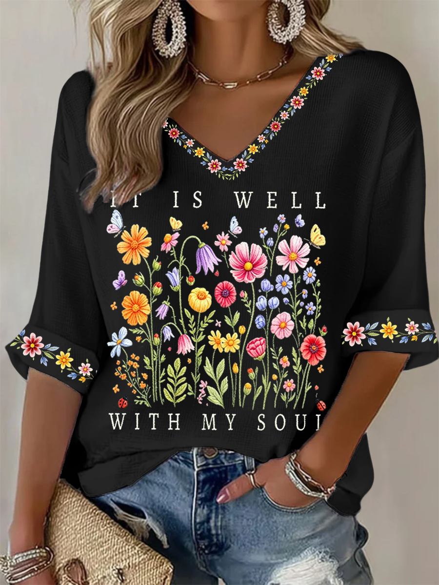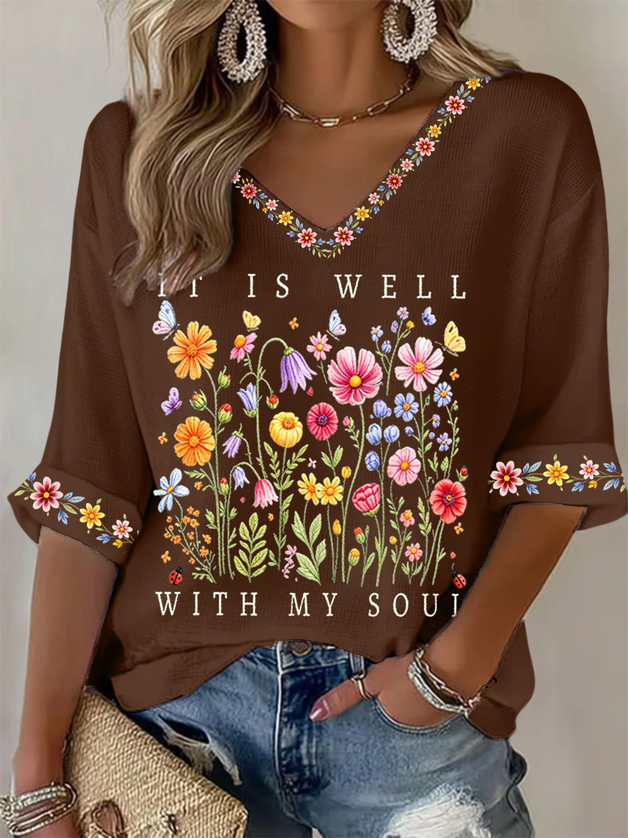 Women's It Is Well With My Soul Floral Print Casual Waffle Top