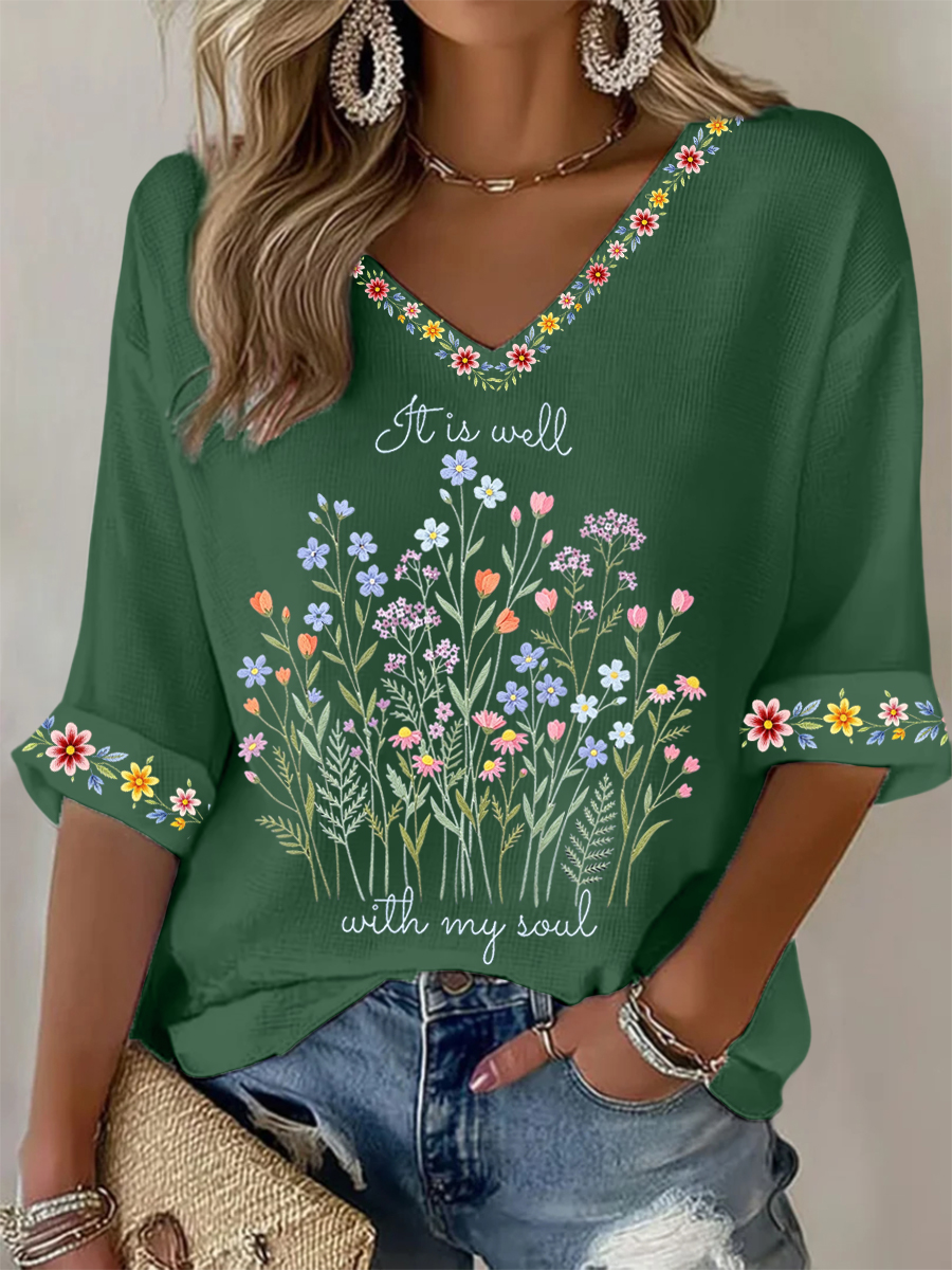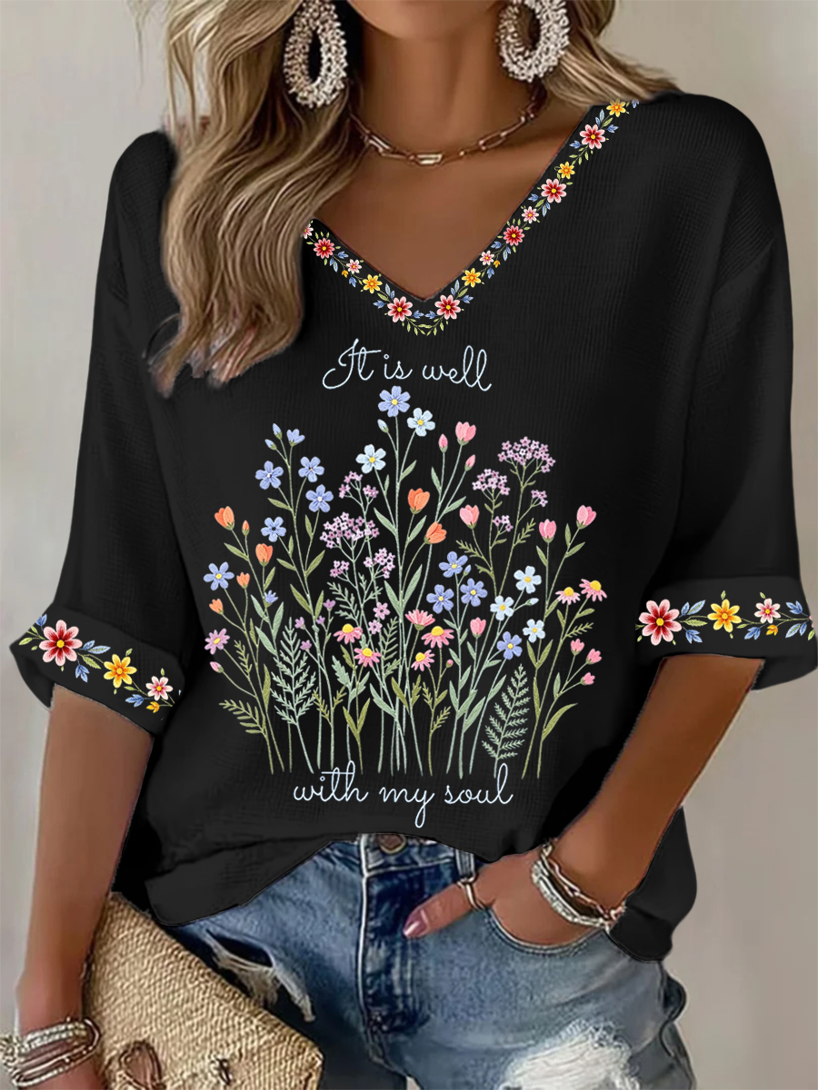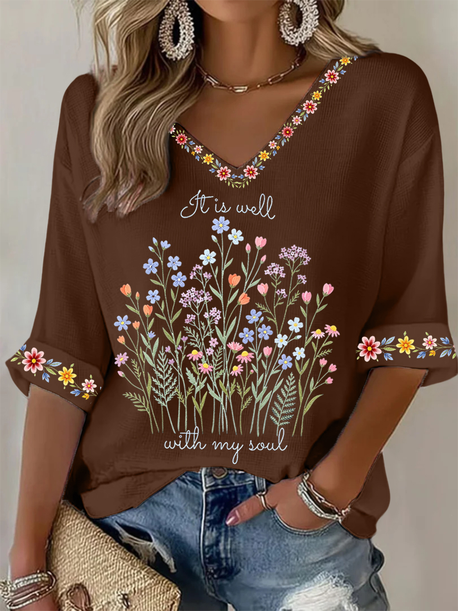 Women's It Is Well With My Soul Floral Print Casual Waffle Top