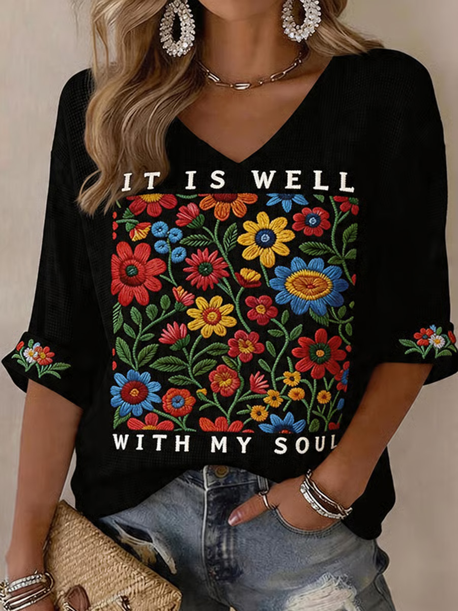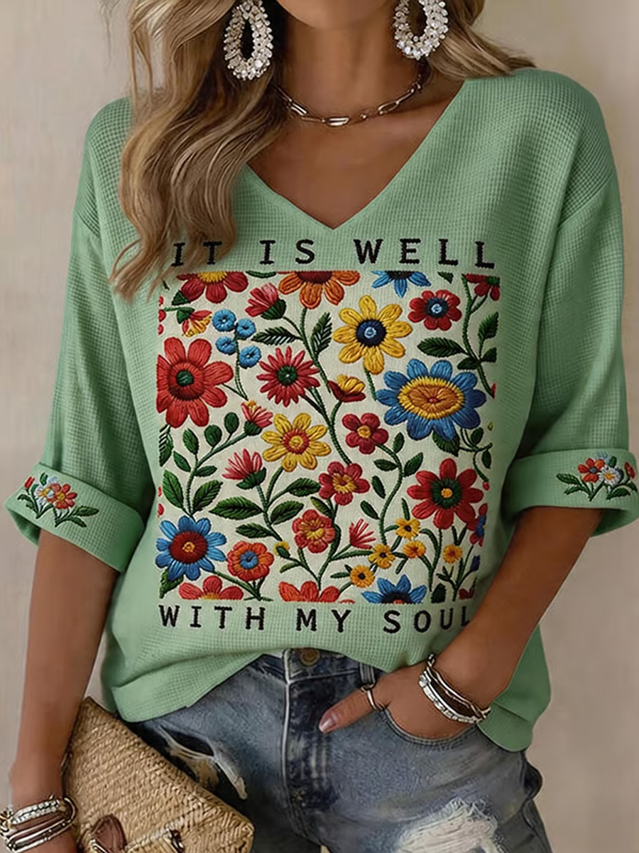 Women's It Is Well With My Soul Floral Print Waffle V-Neck Tee